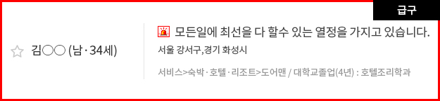 서울 강서구,경기 화성시 서비스>숙박·호텔·리조트>도어맨 / 대학교졸업(4년) : 호텔조리학과